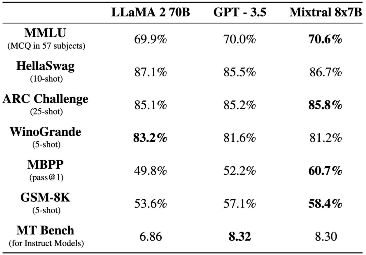 Es vernetzt acht 7B-Modelle und soll in Benchmarks GPT-3.5 und Llama 2 mit 70B übertreffen. Das Kontextfenster ist 32k groß und unterstützt neben Englisch auch Französisch, Italienisch, Deutsch und Spanisch.