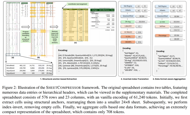 - Strukturelle Anker: Das System identifiziert wichtige Bereiche in der Tabellenkalkulation, die die Gesamtstruktur repräsentieren. Weniger wichtige Daten werden entfernt.