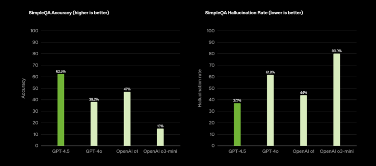 In den Benchmark-Tests zeigt GPT-4.5 zum Teil deutliche Verbesserungen: Im SimpleQA-Test erreicht es eine Genauigkeit von 62,5 % gegenüber 38,2 % bei GPT-4o oder 43,6 % beim jüngst veröffentlichten Grok 3.