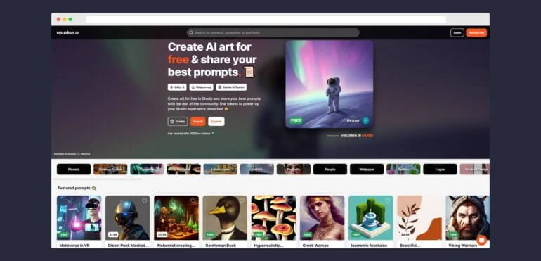 Visualise.ai ist die ausgereifteste und umfangreichste Webseite der hier aufgezählten. Das Projekt hat eine klare Vision, wie es sich refinanzieren will: Neben Bildern, zu denen die entsprechenden Prompts kostenlos ausgegeben werden, dient die Seite auch als Marktplatz für bezahlte Prompts - und setzt sich damit einiger Kritik aus. Denn während manche KI-Künstler kein Problem damit haben, für ihre Texteingaben Geld zu verlangen, sind andere der Meinung, dass diese für alle kostenfrei zugänglich sein sollten.