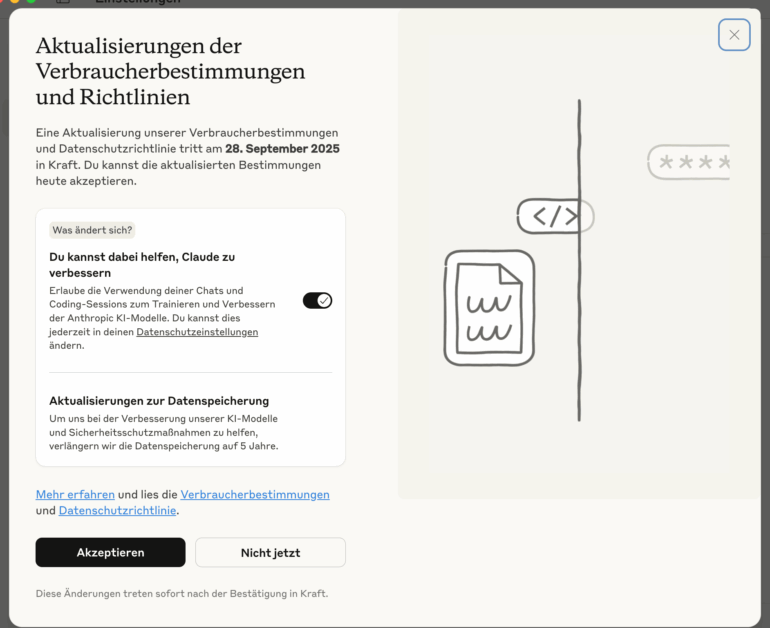 Anthropic stellt seine Datenschutzpraxis für die KI-Chatplattform Claude um – und fordert von Nutzerinnen und Nutzern der Consumer-Produkte (Claude Free, Pro, Max sowie Claude Code) nun eine Entscheidung: Wer nicht bis zum 28. September 2025 aktiv widerspricht, erlaubt dem Unternehmen, neue sowie wiederaufgenommene Chats für das KI-Training zu verwenden. Bei Zustimmung verlängert sich zudem die Speicherfrist von 30 Tagen auf bis zu fünf Jahre. Unternehmens-, Bildungs-, Regierungs- und API-Konten sind davon ausgenommen.