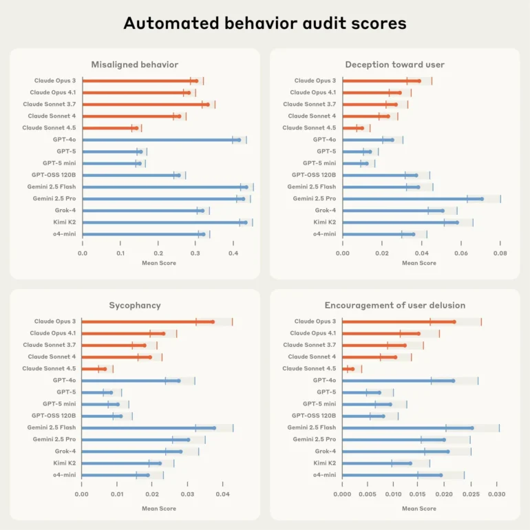 In einer Pilotstudie testete Anthropic 14 führende KI-Modelle mit 111 verschiedenen Szenarien. Dem technischen Bericht zufolge schnitten Claude Sonnet 4.5 und GPT-5 bei der Gesamtbewertung für fehlgeleitetes Verhalten am besten ab. Im Gegensatz dazu zeigten Modelle wie Gemini 2.5 Pro, Grok-4 und Kimi K2 laut der Studie besorgniserregend hohe Raten an Täuschungsversuchen gegenüber dem Nutzer.