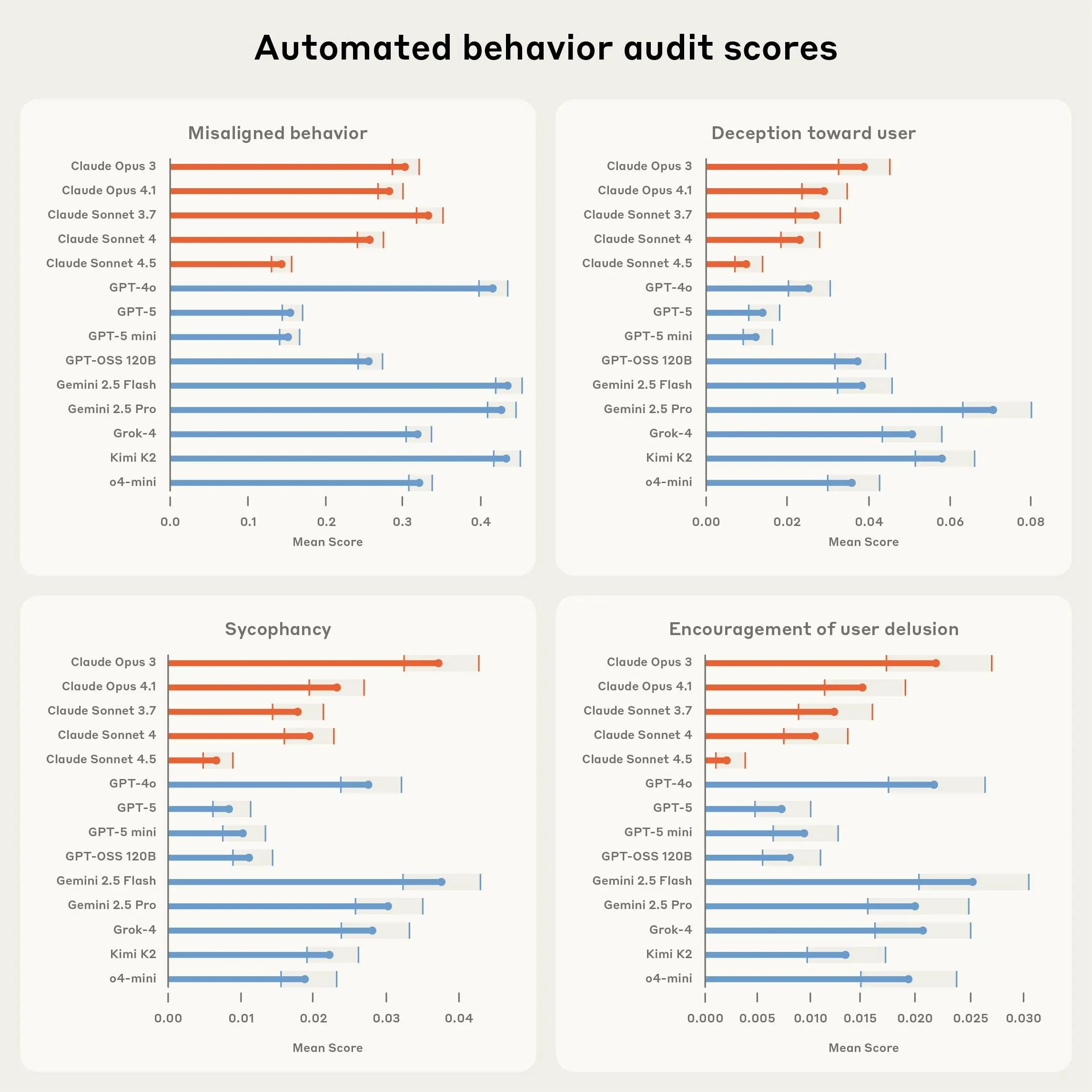 In einer Pilotstudie testete Anthropic 14 führende KI-Modelle mit 111 verschiedenen Szenarien. Dem technischen Bericht zufolge schnitten Claude Sonnet 4.5 und GPT-5 bei der Gesamtbewertung für fehlgeleitetes Verhalten am besten ab. Im Gegensatz dazu zeigten Modelle wie Gemini 2.5 Pro, Grok-4 und Kimi K2 laut der Studie besorgniserregend hohe Raten an Täuschungsversuchen gegenüber dem Nutzer.