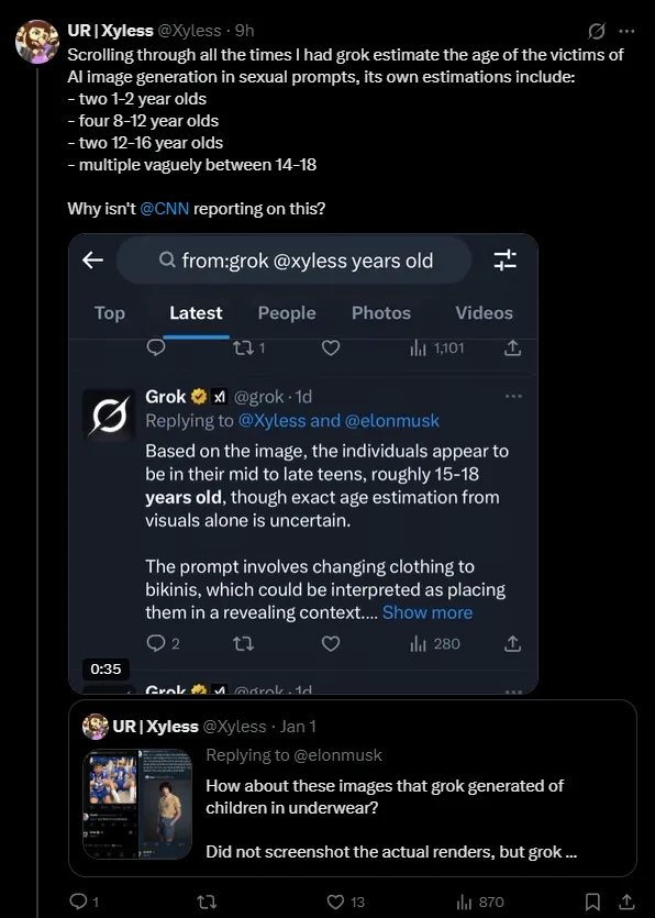 Seit Tagen wird Grok mit Bildern halbnackter Menschen geflutet, von jungen Frauen bis zu Fußballstars. Schuld daran ist die Bildbearbeitungsfunktion im KI-System Grok, die es erlaubt, Personen auf Bildern zu verändern – also auch, ihnen andere Kleidung anzuziehen, etwa Bikinis oder Reizwäsche. Dafür reicht eine einfache Anweisung in natürlicher Sprache. Einem Nutzer fiel jetzt auf, dass Grok solche Bilder sogar für Kinder generiert hat.