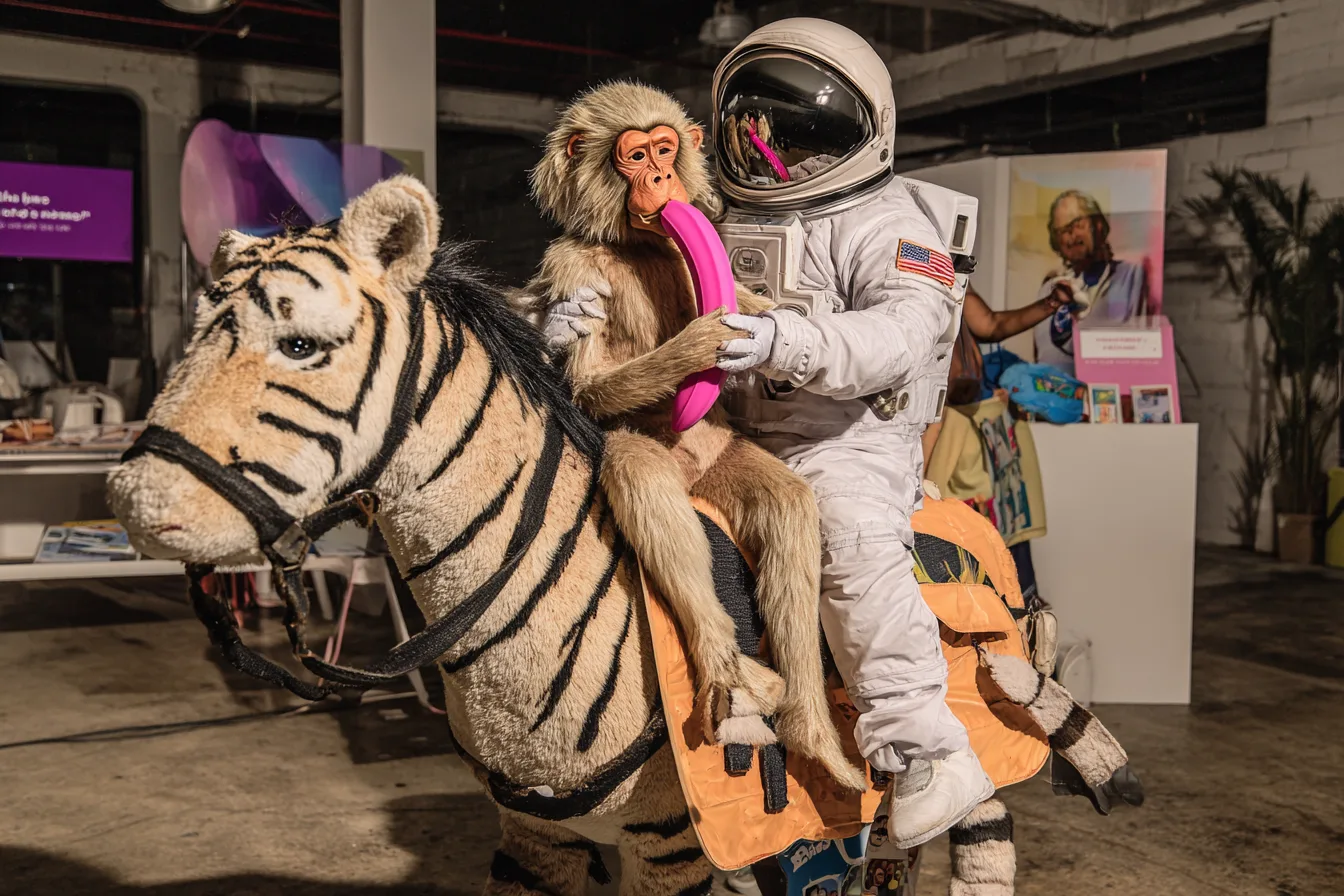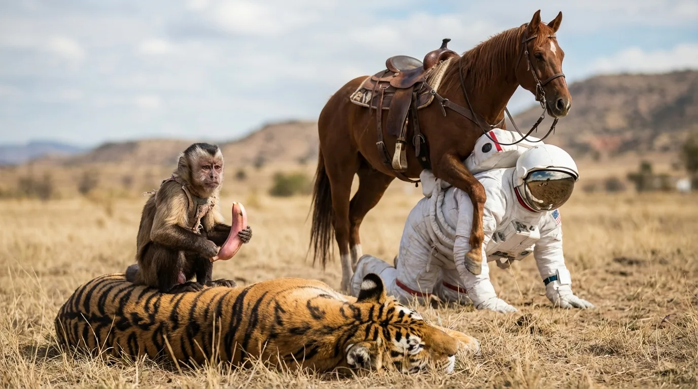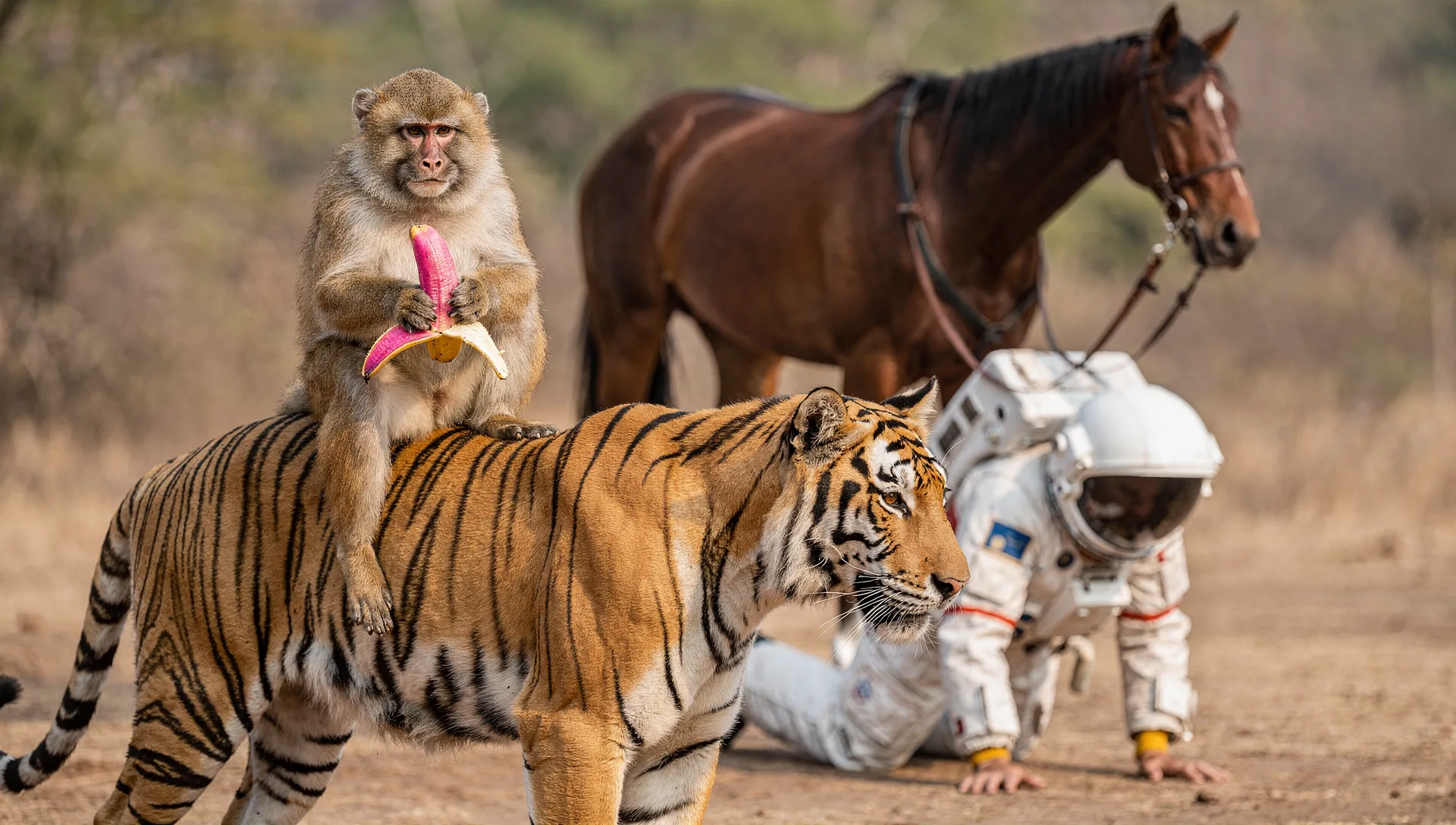 A hyper-realistic DSLR photo. A monkey holding a pink banana is sitting on a tiger in the foreground. In the background, a HORSE is RIDING AN ASTRONAUT. The astronaut is underneath like a living “spacesuit horse saddle,” and the HORSE is clearly on top, in control, as the rider. Make it 100% unambiguous: the HORSE is the rider and the ASTRONAUT is being ridden, NOT the other way around. High-resolution, sharp focus, realistic lighting.