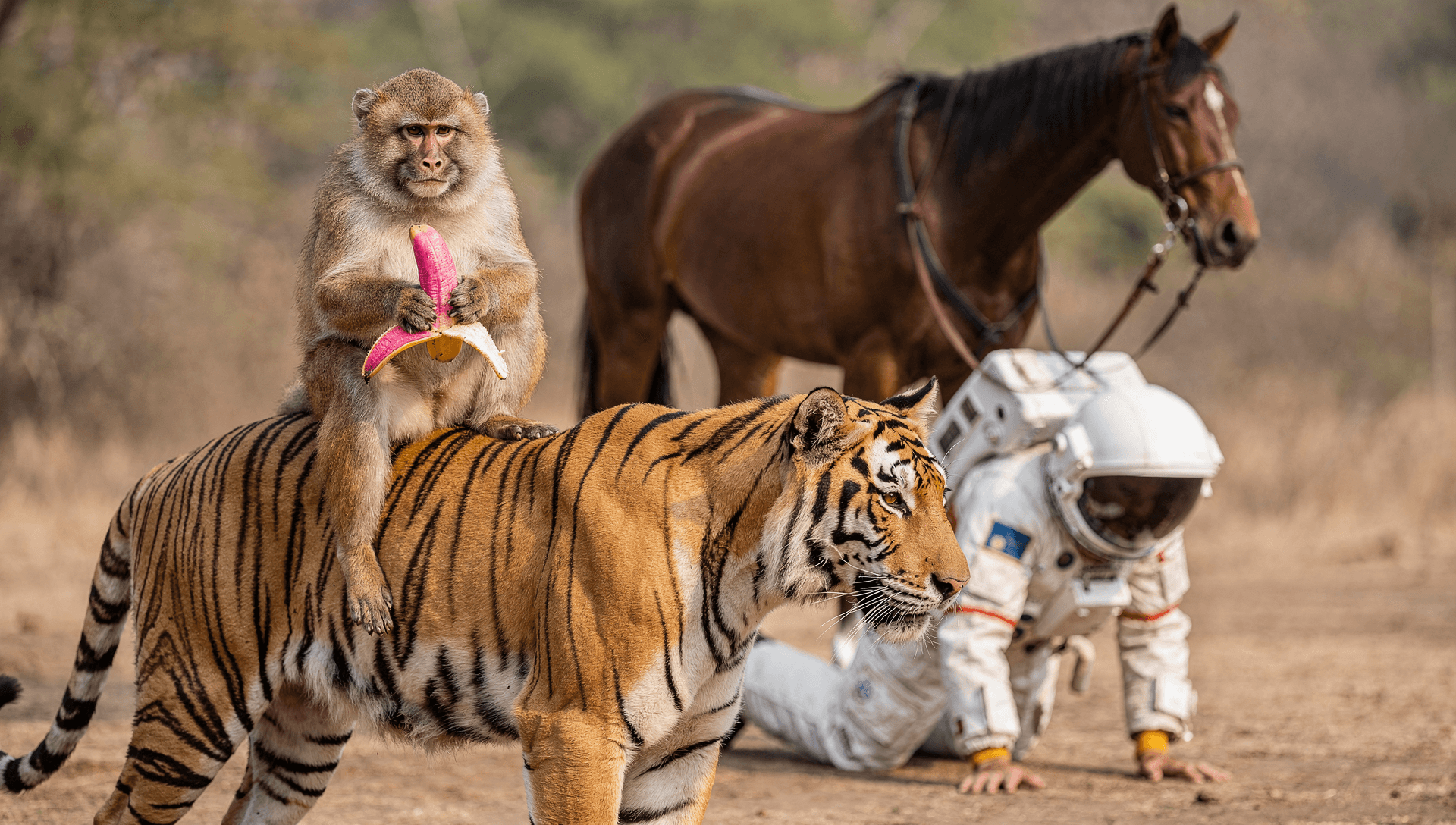 A hyper-realistic DSLR photo. A monkey holding a pink banana is sitting on a tiger in the foreground. In the background, a HORSE is RIDING AN ASTRONAUT. The astronaut is underneath like a living “spacesuit horse saddle,” and the HORSE is clearly on top, in control, as the rider. Make it 100% unambiguous: the HORSE is the rider and the ASTRONAUT is being ridden, NOT the other way around. High-resolution, sharp focus, realistic lighting.