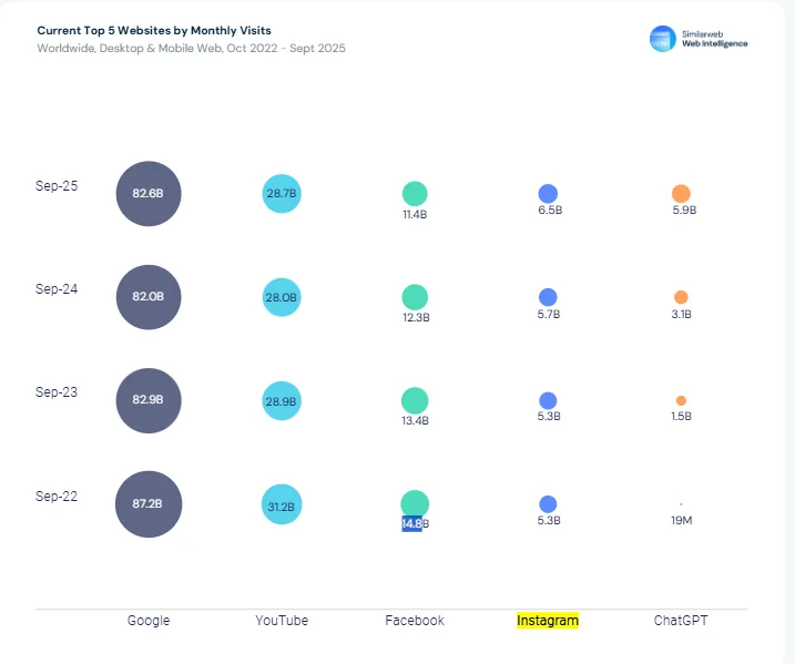 Treibende Kraft hinter dieser Entwicklung bleibt ChatGPT. Die OpenAI‑Plattform ist laut Similarweb von rund 19 Millionen monatlichen Besuchen Ende 2022 auf etwa 5,9 Milliarden Ende 2025 gewachsen – also um das rund 300‑Fache in drei Jahren. Damit zählt der Chatbot nun zu den fünf meistbesuchten Websites weltweit und bewegt sich in einer ähnlichen Größenordnung wie Instagram.