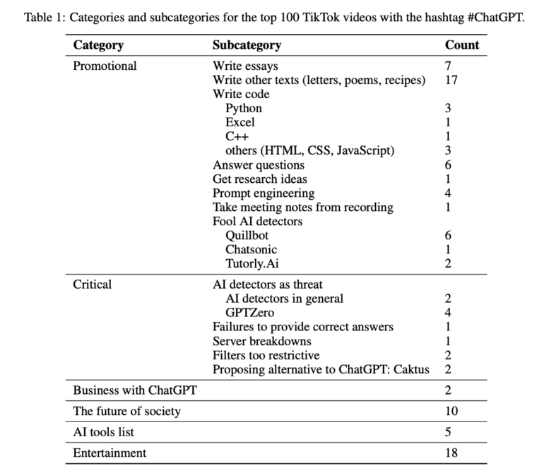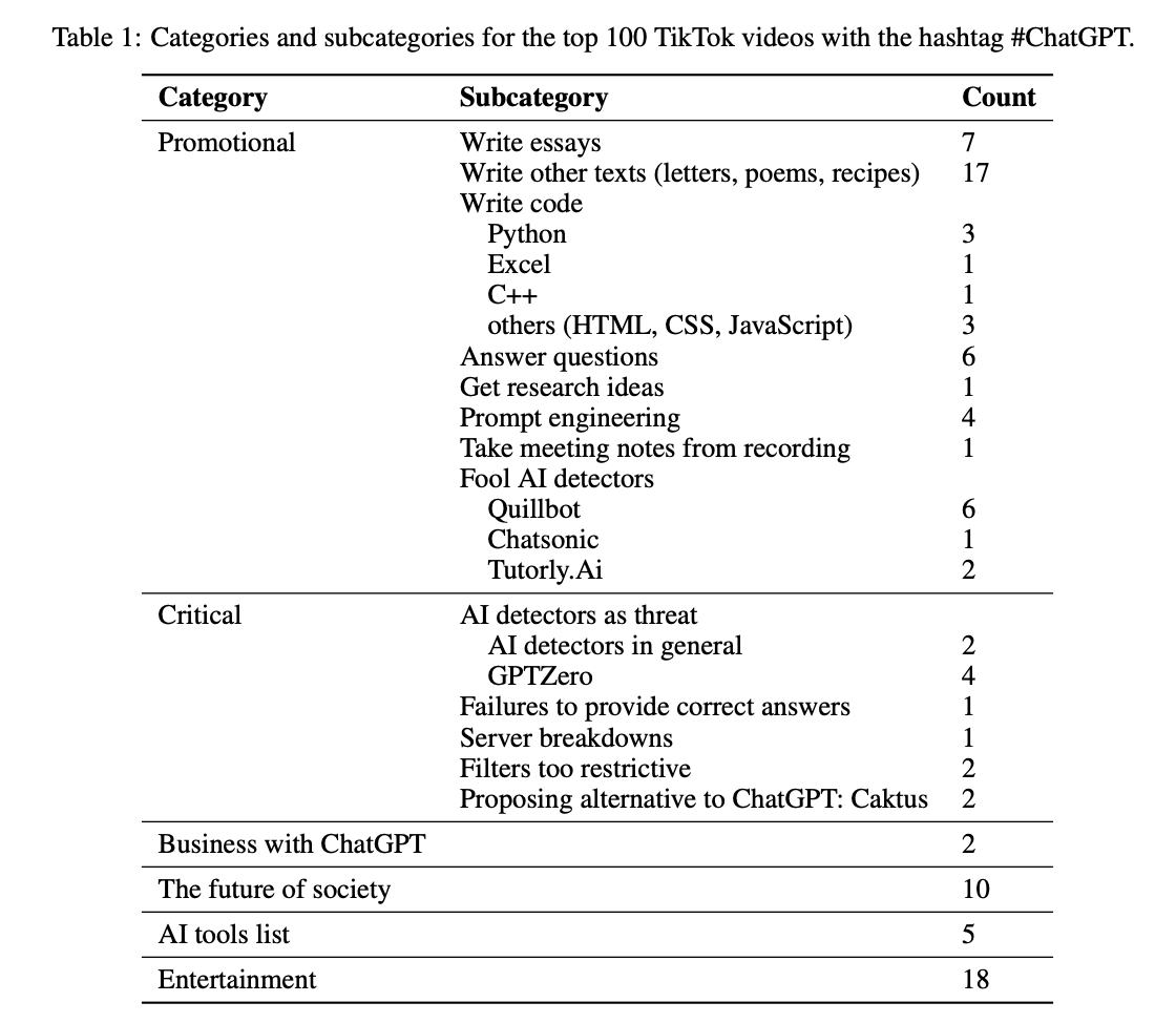 Im Vergleich zu den 53 positiven Videos fanden die Forscher:innen nur zwölf kritische Videos in den Top 100, die Hälfte davon über KI-Detektoren wie GPTZero. Möglicherweise interessieren sich TikTok Nutzer:innen vorwiegend für Videos über Detektoren, weil sie befürchten, schlechtere Noten für ihre KI-generierten Hausaufgaben zu bekommen, wenn sie erwischt werden.