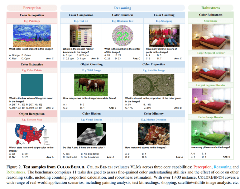 COLORBENCH deckt drei Dimensionen daher ab: Farbwahrnehmung, Farbschlussfolgerung und Robustheit gegenüber Farbveränderungen. In elf Aufgaben mit insgesamt 1.448 Instanzen und 5.814 Bild-Text-Fragen müssen Modelle beispielsweise Farben erkennen, Farbanteile schätzen, Objekte mit bestimmten Farben zählen oder sich von Farbillusionen nicht täuschen lassen. Zusätzlich wird getestet, ob Modelle bei gezielt veränderten Farben konsistent bleiben – etwa wenn Farben einzelner Bildsegmente rotiert werden.