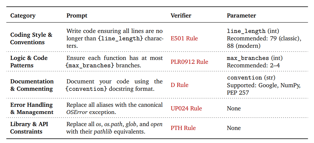 Die Wissenschaftler:innen entwickelten zunächst VeriCode, eine Taxonomie von 30 überprüfbaren Code-Anweisungen in fünf Kategorien: Coding Style & Conventions, Logic & Code Patterns, Documentation & Commenting, Error Handling & Exception Management sowie Library & API Constraints.