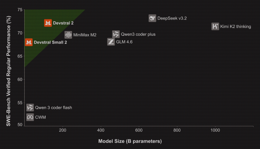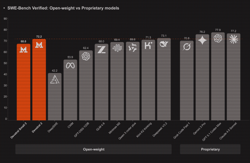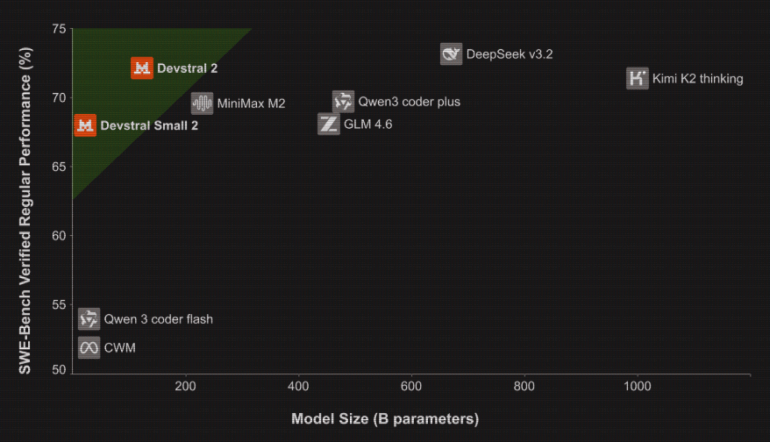 Mit Devstral 2 und Devstral Small 2 veröffentlicht Mistral AI eine neue Familie von Open-Source-Modellen für die Programmierung. Devstral 2 mit 123 Milliarden Parametern erreicht im SWE-Bench Verified Benchmark 72,2 Prozent und übertrifft damit viele andere offene Modelle. Laut Mistral AI ist es bis zu siebenmal kosteneffizienter als Claude Sonnet. Es benötigt vier H100-Class-GPUs. Das kleinere Modell Devstral Small 2 (24 Milliarden Parameter) lässt sich dagegen auf handelsüblicher Hardware lokal betreiben.