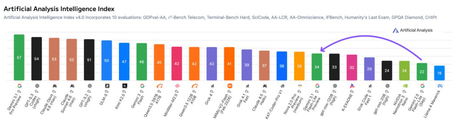 Laut der Analyseplattform Artificial Analysis erreicht das Modell 34 Punkte auf deren Intelligence Index, zwölf Punkte mehr als der Vorgänger Gemini 2.5 Flash-Lite. Mit mehr als 360 ausgegebenen Tokens pro Sekunde und einer durchschnittlichen Antwortzeit von 5,1 Sekunden bleibt das Modell so schnell wie sein Vorgänger.
