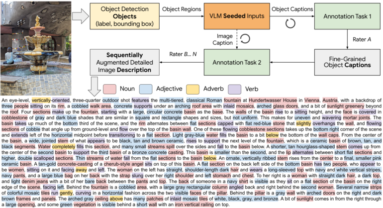 - Menschliche Beschreiber:innen verfeinern die KI-generierten objektbezogenen Beschreibungen anhand eines umfangreichen Leitfadens, der auf Eigenschaften wie Funktion, Form, Größe, Farbe, Muster, Textur und Beziehungen zwischen Objekten achtet.