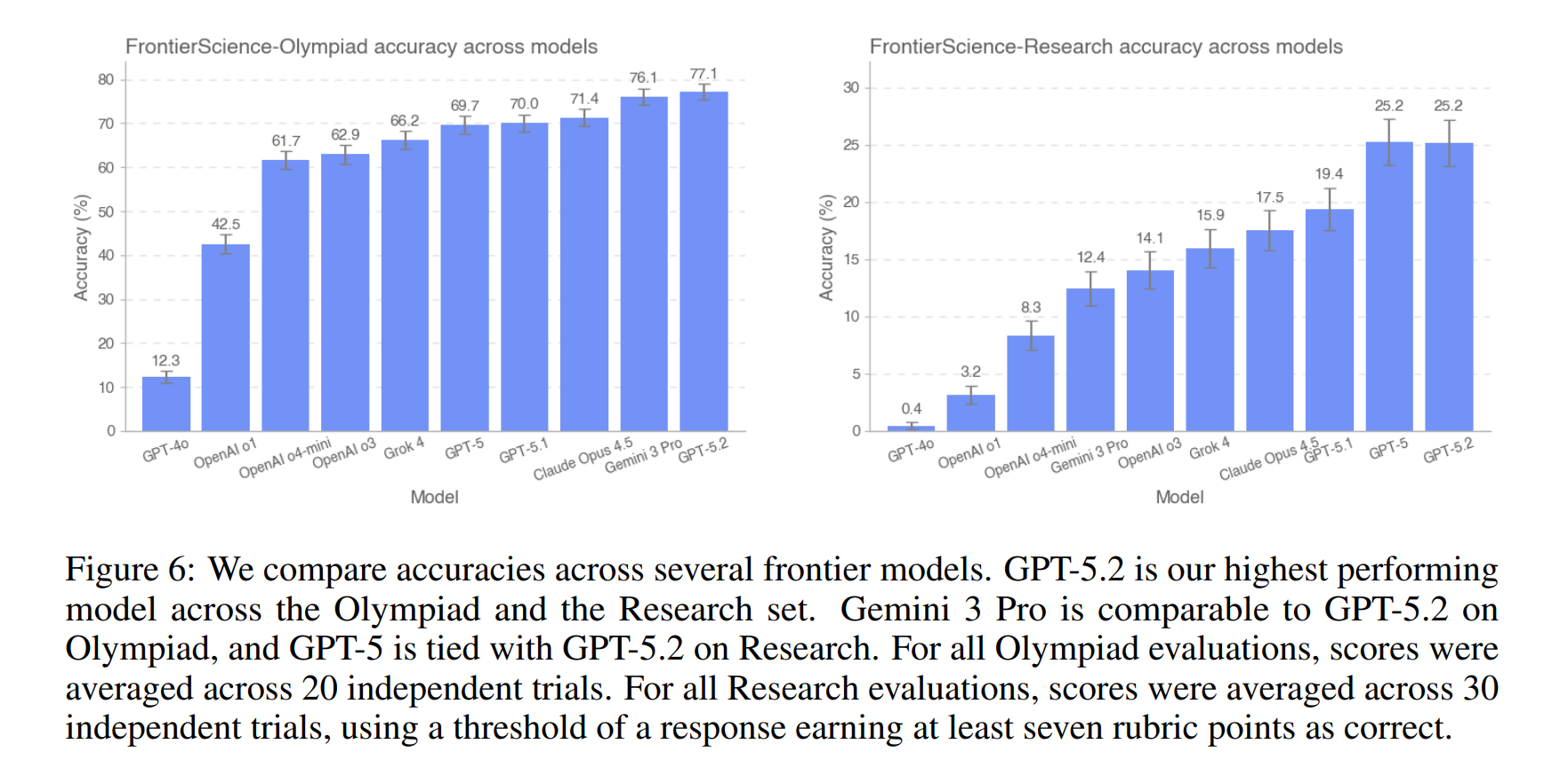 - GPT-5.2 erreicht 77 Prozent beim Olympiad-Set und 25 Prozent beim Research-Set. Gemini 3 Pro folgt bei Olympiad mit 76 Prozent knapp dahinter, während Claude Opus 4.5 auf 71 Prozent bei Olympiad und 18 Prozent bei Research kommt.