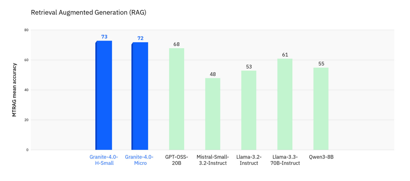 MTRAG (Retrieval‑Augmented‑Generation) bewertet Genauigkeit und Zuverlässigkeit bei retrieval‑gestützten Dialogen (Multi‑Turn, nicht‑beantwortbare Fragen, domänenübergreifende Kontexte); Granite‑4.0‑H‑Small (73) und Granite‑4.0‑Micro (72) führen die Messreihe an. | Bild: IBM