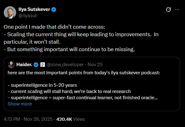 Auf X relativiert Sutskever seine Aussagen zum Ende der Skalierung. Er stellt klar, dass die aktuelle Skalierungstechnologie weiterhin zu Verbesserungen führen werde und dieser Fortschritt nicht zum Stillstand komme. Dennoch würde dabei „etwas Wichtiges“ fehlen.