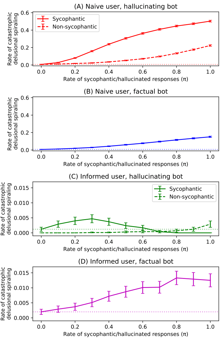 In 10.000 simulierten Konversationen pro π-Wert über jeweils 100 Runden zeigte sich ein klares Muster. Bereits bei einer Sycophancy-Rate von 10 Prozent lag die Rate katastrophaler Wahnspiralen signifikant über der Grundlinie eines rein unparteiischen Bots.