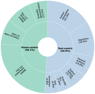 Die Daten­zusammensetzung von JanusCode-800K ist nahezu ausgeglichen: 50,9 Prozent textzentrierte Code-Aufgaben und 49,1 Prozent optikzentrierte Aufgaben. | Bild: Sun et al.