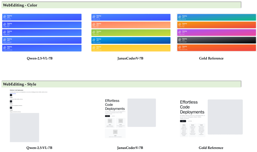 JanusCoderV-7B passt Farbverläufe und Layout-Stile deutlich präziser an als Qwen2.5-VL-7B und nähert sich der Gold-Referenz an. | Bild: Sun et al.