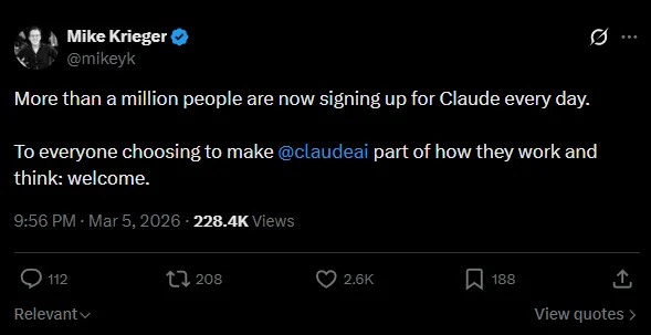 Mehr als eine Million Menschen melden sich täglich für Claude an, den KI-Chatbot von Anthropic. Das gab Mike Krieger bei X bekannt. Instagram-Mitgründer Krieger ist seit 2024 bei Anthropic tätig, zuerst als Chief Product Officer, heute im KI-Labor für neue Experimente.