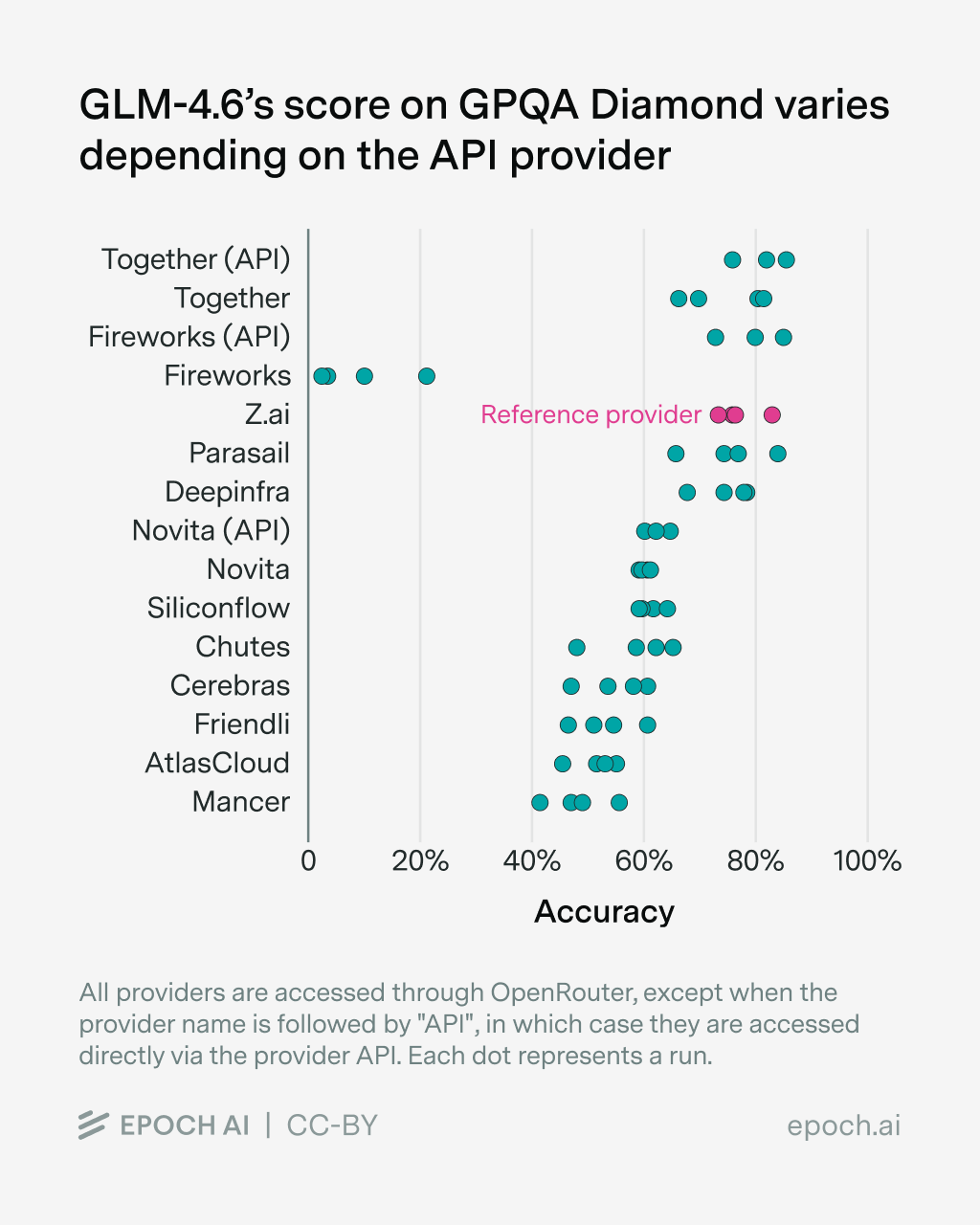 GLM-4.6 erzielt auf GPQA-Diamond je nach API-Provider deutlich andere Ergebnisse. | Bild: Epoch AI