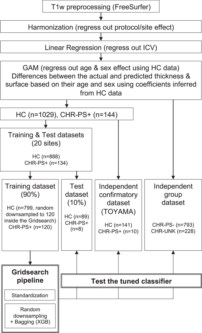 Das internationale Forscherteam sammelte und analysierte MRT-Daten von insgesamt 1165 Personen mit einem klinisch erhöhten Risiko für Psychosen (CHR), darunter 144 Teilnehmer, die später tatsächlich eine Psychose entwickelten (CHR-PS+), 793 Personen, die keine Psychose entwickelten (CHR-PS-), und 228 mit unklarem Follow-up-Status (CHR-UNK). Zusätzlich wurden die Daten von 1029 gesunden Kontrollpersonen (HCs) zum Vergleich herangezogen.