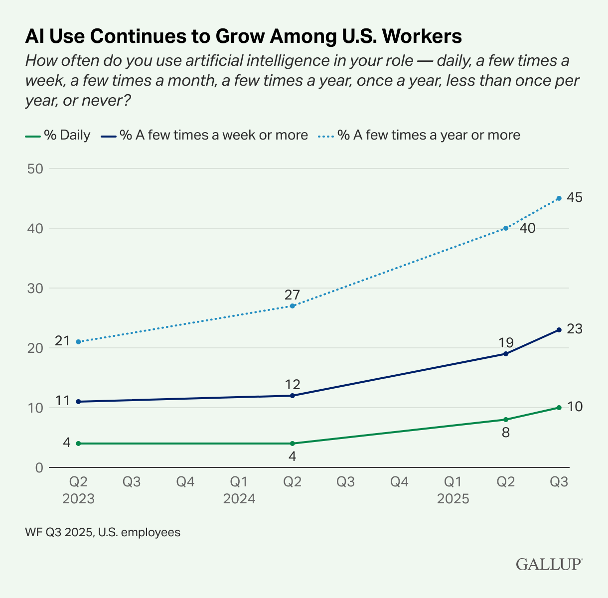 Liniendiagramm von Gallup zeigt KI-Nutzung unter US-Arbeitnehmern von Q2 2023 bis Q3 2025. Drei Linien zeigen tägliche Nutzung (4% auf 10%), wöchentliche Nutzung (11% auf 23%) und gelegentliche Nutzung (21% auf 45%). Alle Kurven steigen beschleunigt an.