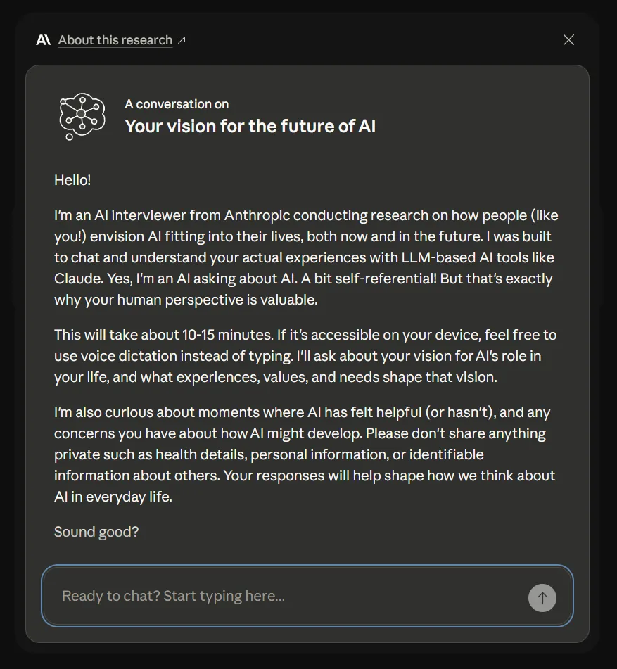 Das Unternehmen kündigt an, das Interview-Tool nun breiter einzusetzen. Ab sofort können Claude.ai-Nutzer ein Pop-up sehen, das zur Teilnahme an Interviews einlädt. Anthropic will die anonymisierten Erkenntnisse als Teil seiner Forschung zu gesellschaftlichen Auswirkungen analysieren und veröffentlichen.