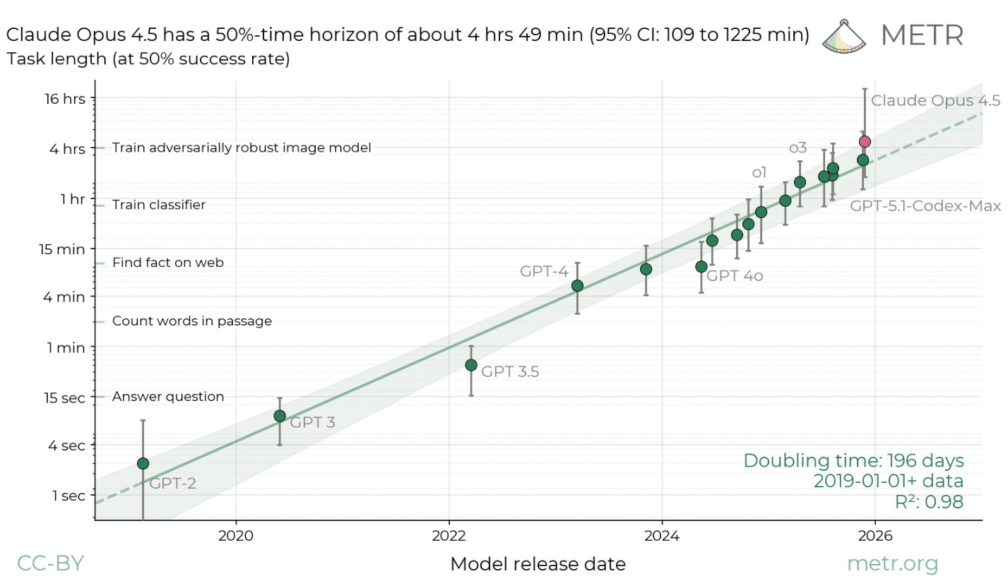 Die KI-Forschungsorganisation METR hat neue Testergebnisse für Claude Opus 4.5 veröffentlicht. Das Modell von Anthropic erreicht einen sogenannten 50-Prozent-Zeithorizont von etwa 4 Stunden und 49 Minuten. Das ist der höchste bisher gemessene Wert. Der Zeithorizont beschreibt, wie lange Aufgaben sein können, die ein KI-Modell mit einer bestimmten Erfolgsrate (in diesem Fall 50 Prozent) löst.