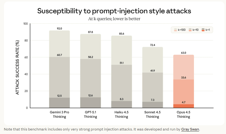Trotz dieser Lücken schneidet Opus 4.5 besser ab als Konkurrenten wie Googles Gemini 3 Pro oder GPT-5.1, die Angriffsraten von bis zu 92 Prozent zuließen. Bei einer Prompt Injection werden versteckte Befehle eingeschleust, um Sicherheitsfilter zu umgehen; ein seit Jahren bekanntes Cybersecurity-Problem von LLMs, für das es bis heute kein Gegenmittel gibt, und das bei agentischer KI besonders gravierend ist, da es hier mehr Einfallstore gibt.