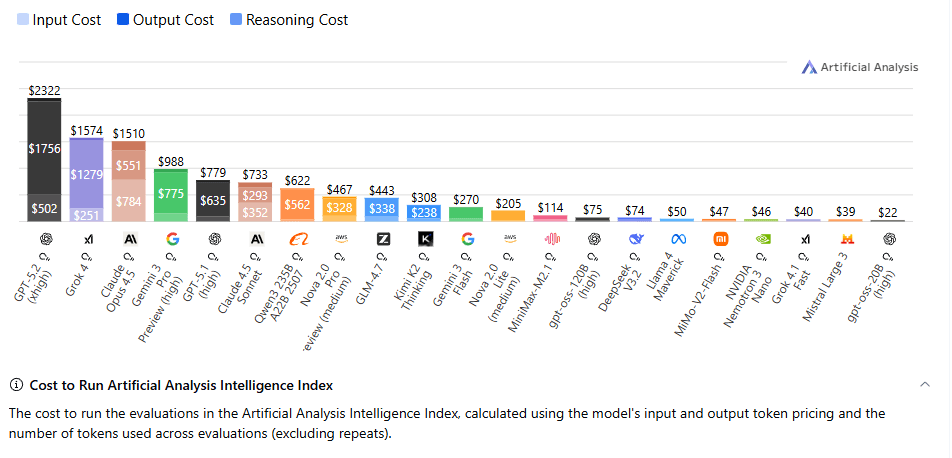 Artificial Analysis Intelligence Index v4.0: Gesamtranking der KI-Modelle. GPT-5.2 (xhigh) führt mit 50 Punkten, gefolgt von Claude Opus 4.5 (49) und Gemini 3 Pro Preview (48). Die Spitzenmodelle liegen eng beieinander. | Bild: Artificial AnalysisAn der Spitze der Kostentabelle steht GPT-5.2 (xhigh) mit Gesamtkosten von 2.322 US-Dollar, gefolgt von Grok 4 (1.574 US-Dollar) und Claude 4.5 Opus (1.510 US-Dollar). Mit deutlichem Abstand reiht sich dahinter Gemini 3 Pro Preview (988 US-Dollar) ein. | Bild: Artificial Analysis