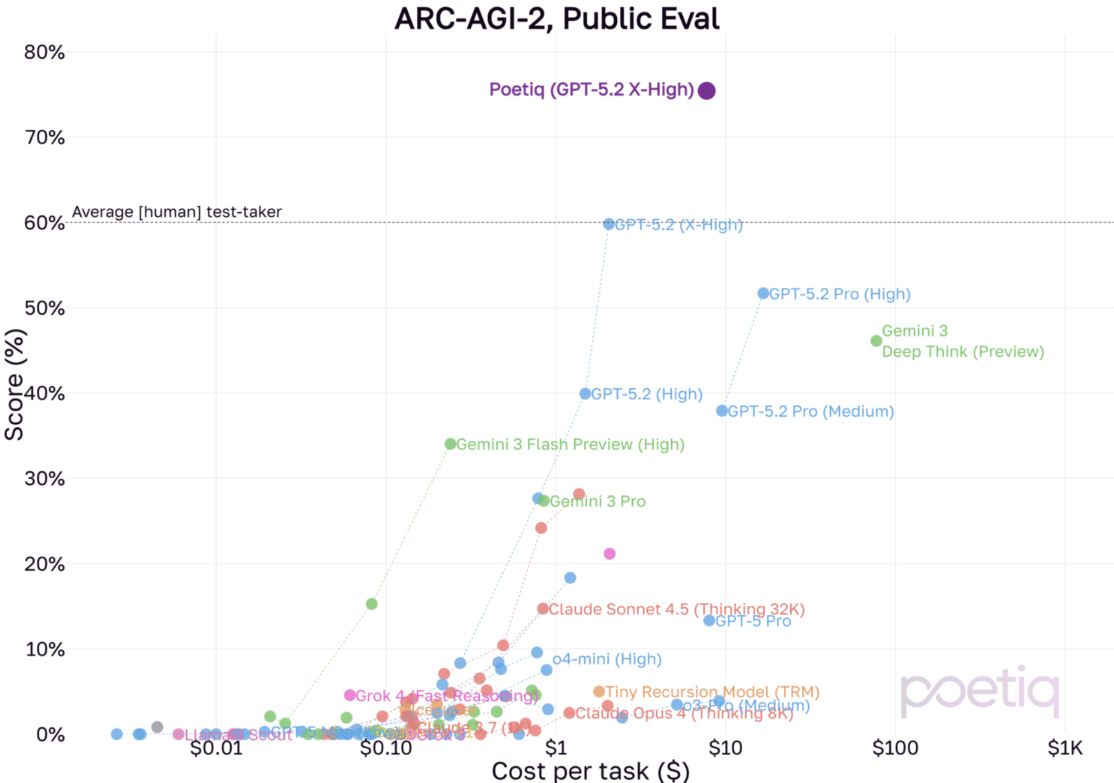 Poetiq hat die Messlatte beim ARC-AGI-2-Benchmark noch weiter nach oben verschoben. Das KI-Start-up erreichte mit OpenAIs GPT-5.2 X-High eine Trefferquote von 75 Prozent auf dem öffentlichen Testdatensatz. Das übertrifft den bisherigen Bestwert (siehe unten) um etwa 15 Prozentpunkte und liegt deutlich über menschlichem Niveau. Die Kosten lagen bei unter 8 Dollar pro Aufgabe, deutlich günstiger als zuvor.