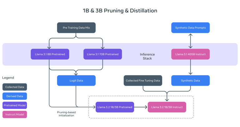 Um die leichtgewichtigen 1B und 3B Modelle zu optimieren, setzte Meta auf eine Kombination aus Pruning und Wissensübertragung durch größere Lehrer-Modelle. Beim strukturierten Pruning in einem einzigen Durchgang vom vorangehenden Llama-3.1-8B-Modell wurden systematisch Teile des Netzwerks entfernt und die Gewichte angepasst.