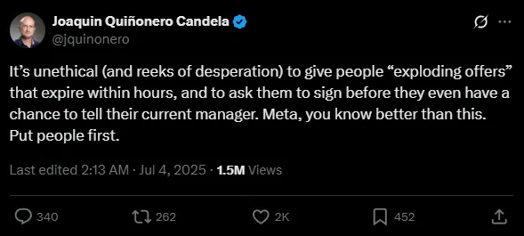 OpenAIs Personalchef Joaquin Quiñonero Candela kritisiert auf X die Abwerbungspraktiken von Meta. Demnach unterbreitet Meta Mitarbeiterinnen und Mitarbeitern von OpenAI hochdotierte Angebote, die nur wenige Stunden gültig sind. Das verhindere einen angemessenen Austausch zwischen den Kandidaten und ihren Vorgesetzten. Solche Vorgehensweisen bezeichnete Candela als "unethisch" und "verzweifelt wirkend".