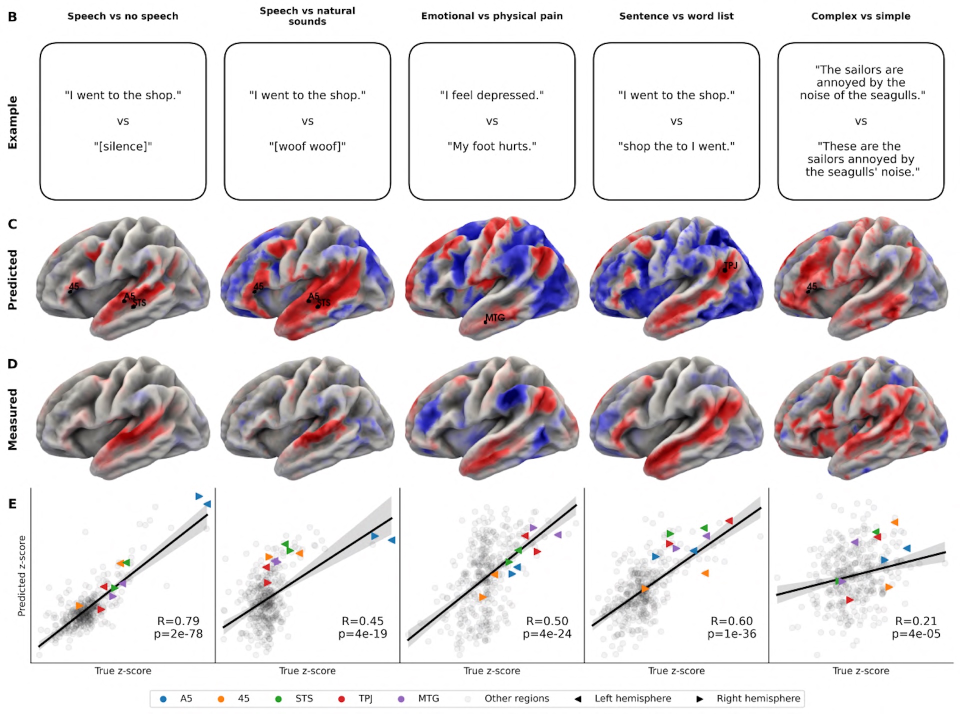 Bei Sprachexperimenten repliziert TRIBE v2 klassische neurolinguistische Befunde, etwa die Unterscheidung zwischen Sprache und Stille, emotionalem und physischem Schmerz oder Sätzen und Wortlisten. Die vorhergesagten Aktivierungsmuster stimmen mit den gemessenen Daten überein. | Bild: Meta