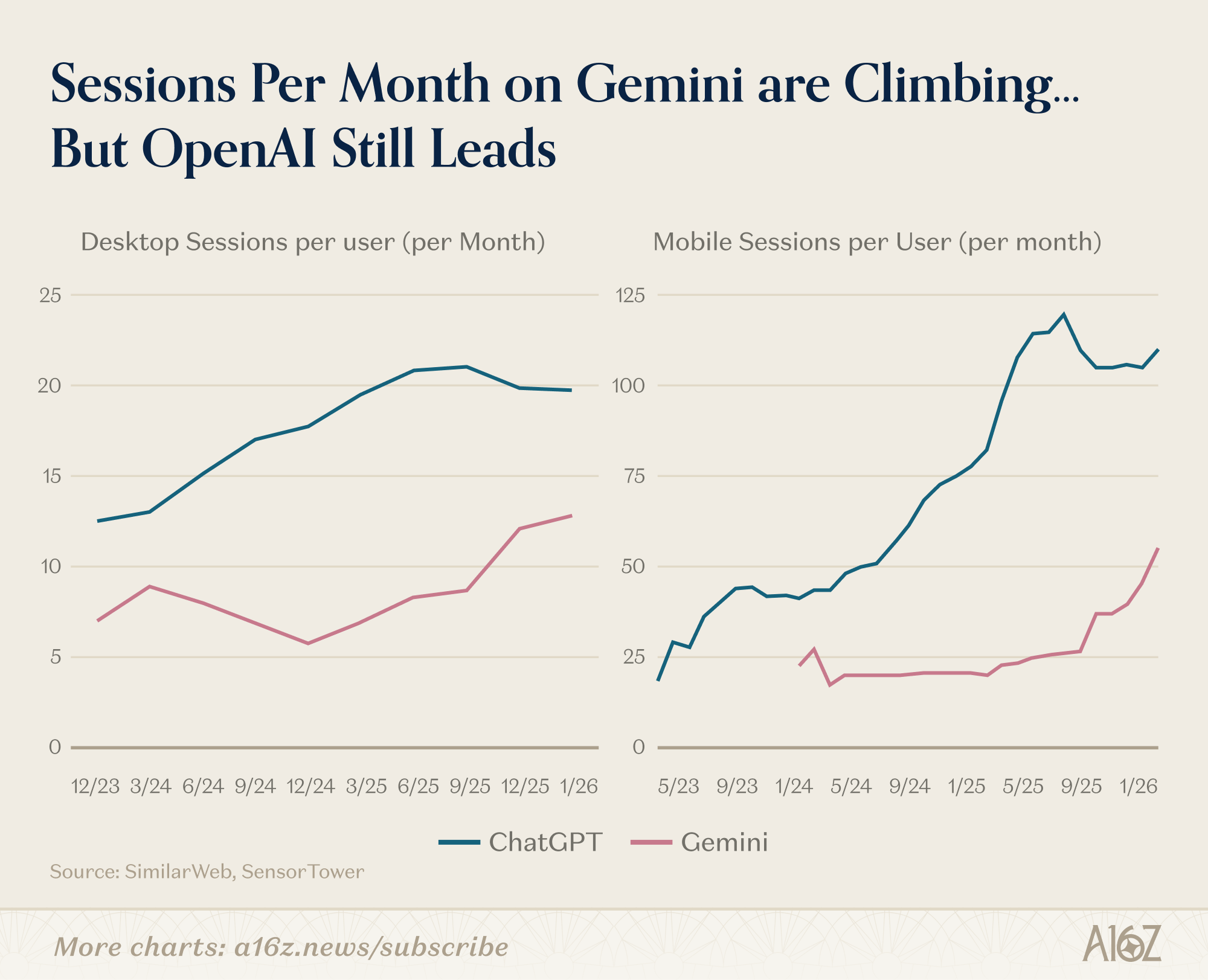 Geminis Nutzungsintensität steigt, doch ChatGPT liegt bei den Sessions pro Nutzer weiterhin deutlich vorn. | Bild: a16z