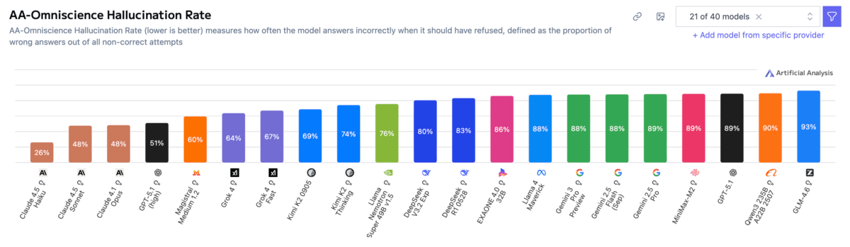 Claude 4.1 Opus erreichte dagegen 36 Prozent Genauigkeit bei einer der niedrigsten Halluzinationsraten und erzielte so vor Veröffentlichung von Gemini 3 Pro den besten Gesamtscore.