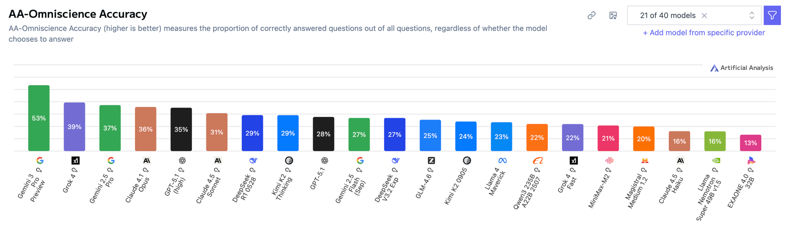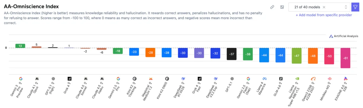 Claude 4.1 Opus erreichte dagegen 36 Prozent Genauigkeit bei einer der niedrigsten Halluzinationsraten und erzielte so vor Veröffentlichung von Gemini 3 Pro den besten Gesamtscore.