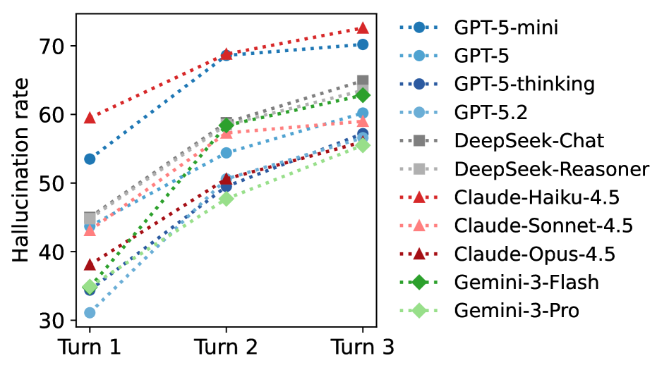 Die Halluzinationsrate steigt bei allen getesteten Modellen mit jeder weiteren Gesprächsrunde an. | Bild: Fan et al.