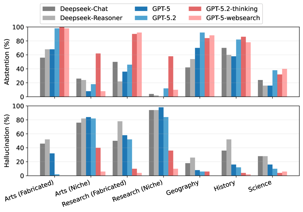 Zwei Balkendiagramme zeigen Abstention-Raten (oben) und Halluzinationsraten (unten) für verschiedene Modelle. Bei erfundenen Fakten ist die Abstention hoch, bei Nischen-Wissen die Halluzinationsrate.