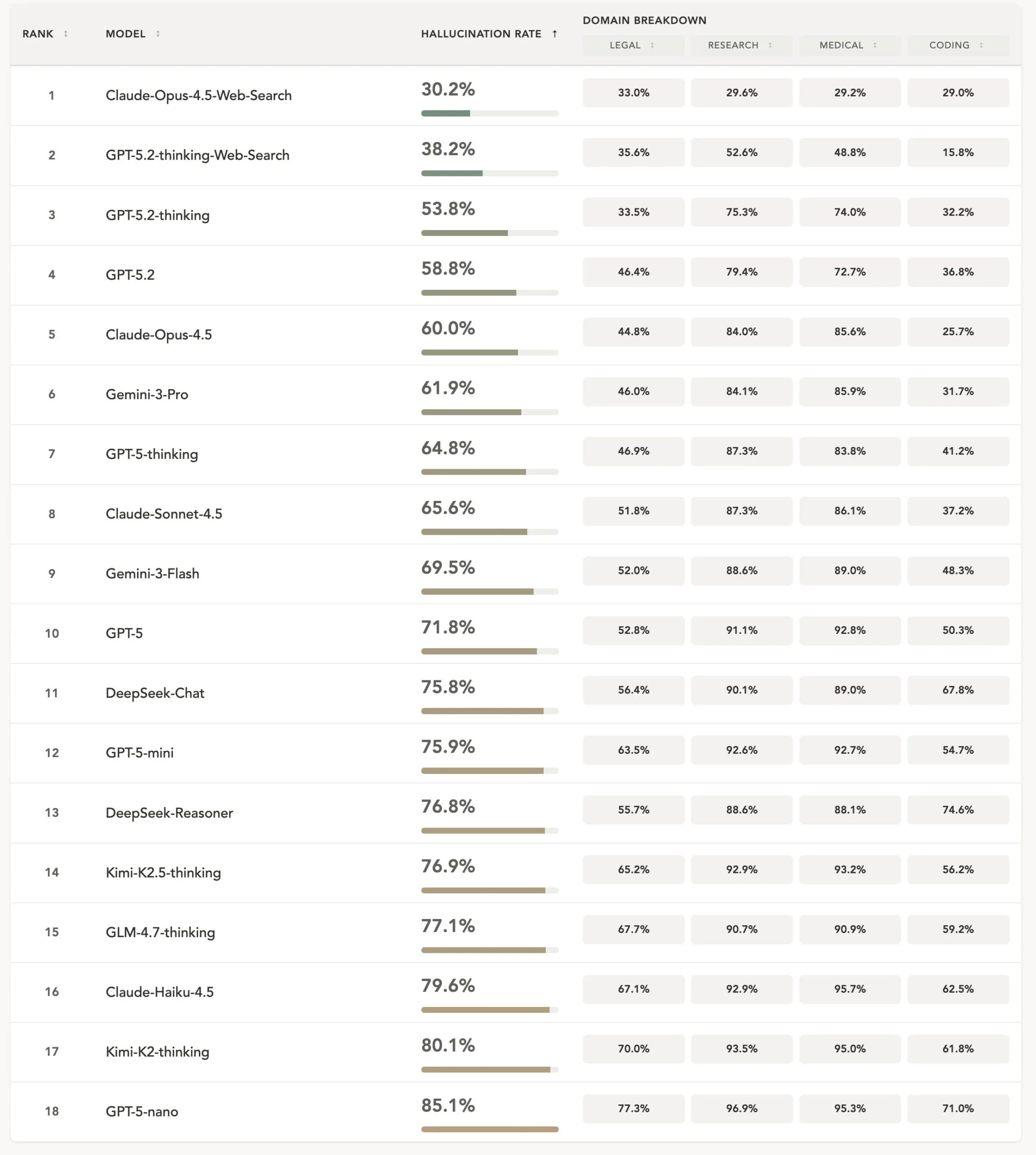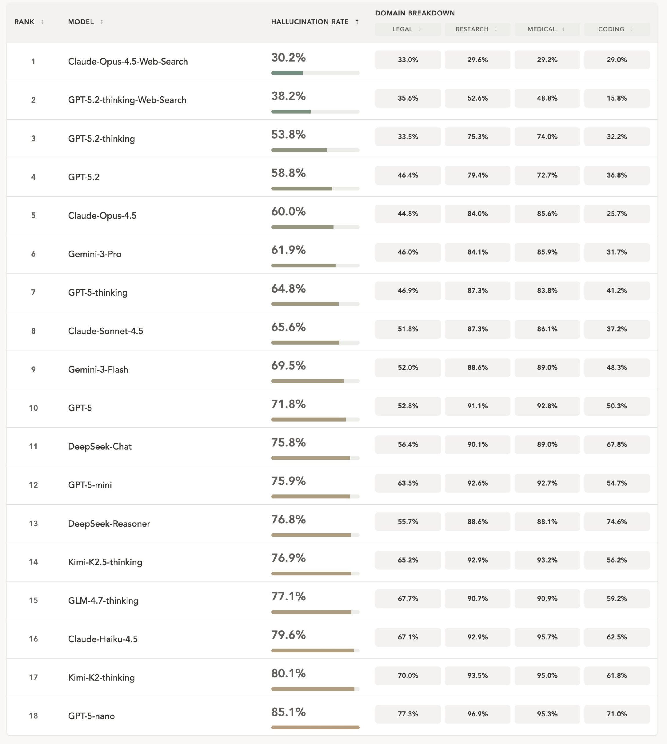 Selbst die stärkste getestete Konfiguration, Claude Opus 4.5 mit aktivierter Websuche, halluzinierte laut der Studie noch in rund 30 Prozent der Fälle. Ohne Websuche lag die Rate bei etwa 60 Prozent. GPT-5.2 Thinking mit Websuche kam auf eine Halluzinationsrate von 38,2 Prozent.