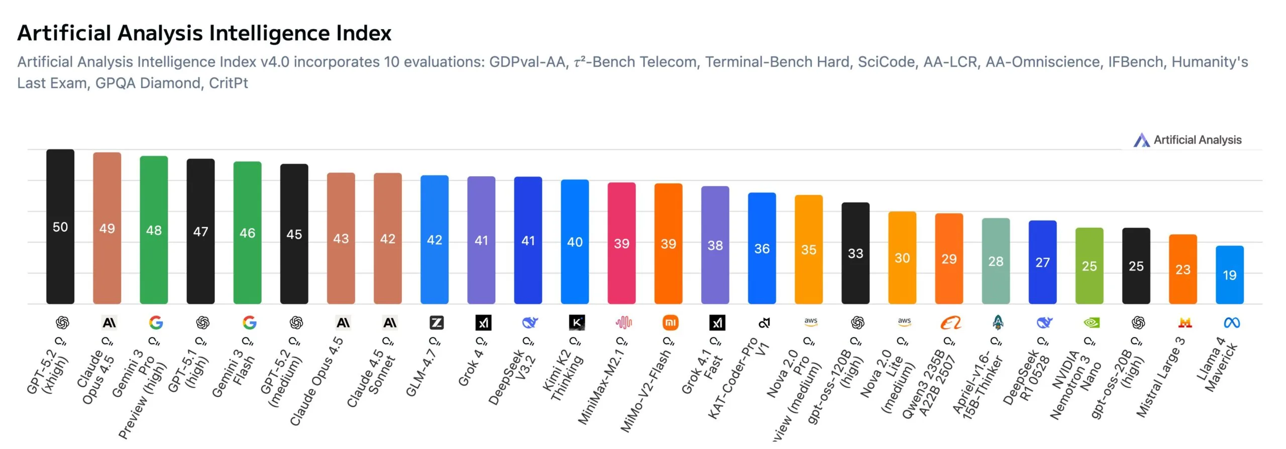 Artificial Analysis hat Version 4.0 seines Intelligence Index veröffentlicht, der die Leistung von KI-Modellen über verschiedene Benchmarks hinweg misst. OpenAIs GPT-5.2 mit höchster Reasoning-Stufe führt das Ranking an, gefolgt von Anthropics Claude Opus 4.5 und Googles Gemini 3 Pro.