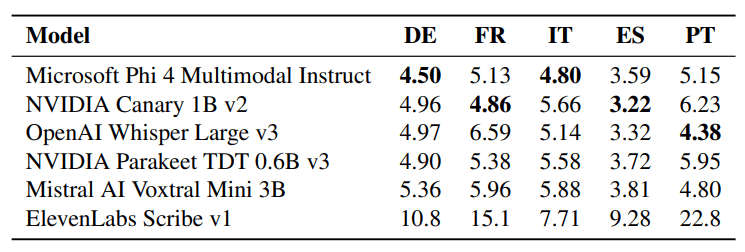 Microsofts Phi-4-Multimodal-Instruct führt auf Deutsch und Italienisch die mehrsprachigen Tests an. Nvidias Modellreihe zeigt den Trade-off besonders deutlich. Die v3-Version des Parakeet TDT unterstützt 25 Sprachen statt nur einer wie die v2-Version, schneidet aber bei englischen Texten schlechter ab.