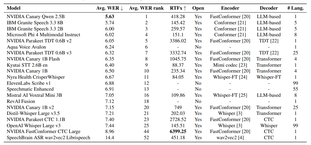 Bei der englischen Spracherkennung zeigen sich deutliche Unterschiede zwischen verschiedenen Systemtypen. Modelle, die auf großen Sprachmodellen basieren, erreichen die besten Erkennungsraten. Nvidias Canary Qwen 2.5B führt mit einer WER von 5,63 Prozent.