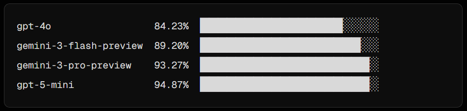 Horizontales Balkendiagramm: GPT-4o 84,23 %, Gemini 3 Flash Preview 89,20 %, Gemini 3 Pro Preview 93,27 %, GPT-5 Mini 94,87 % auf LongMemEval.
