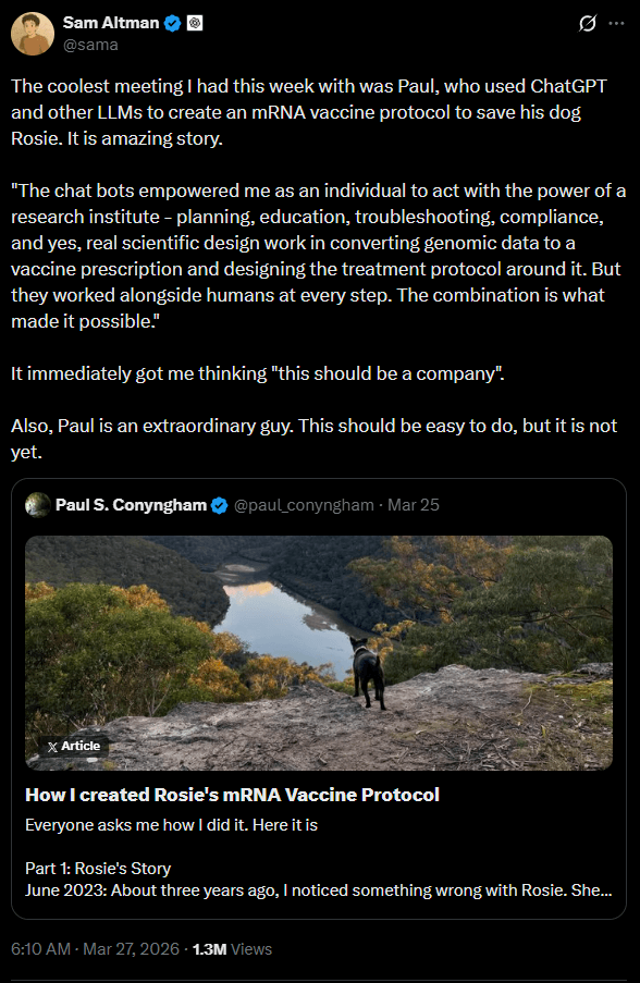 OpenAI-CEO Sam Altman und Produktchef Kevin Weil nutzten die Geschichte für ihre Zwecke. Weil schrieb, Paul habe mit ChatGPT und AlphaFold ein personalisiertes mRNA-Impfprotokoll für den Krebs seines Hundes erstellt – ein "Blick in die Zukunft der personalisierten Medizin".