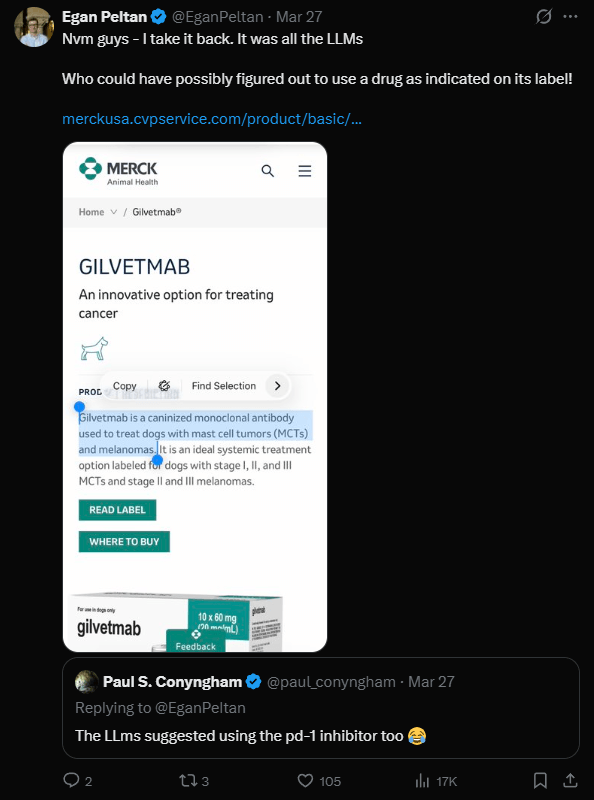 Egan Peltan (siehe Bericht unten) widerspricht erneut scharf: Es gebe null Beweise, dass die KI-gestützte Arbeit etwas für Rosies Krebs bewirkt habe. Conyngham habe gleichzeitig einen sogenannten PD-1-Hemmer verabreicht, ein zugelassenes Immuntherapie-Medikament, das Krebszellen für das Immunsystem wieder sichtbar macht und als eine der wirksamsten Krebsimmuntherapien überhaupt gilt.