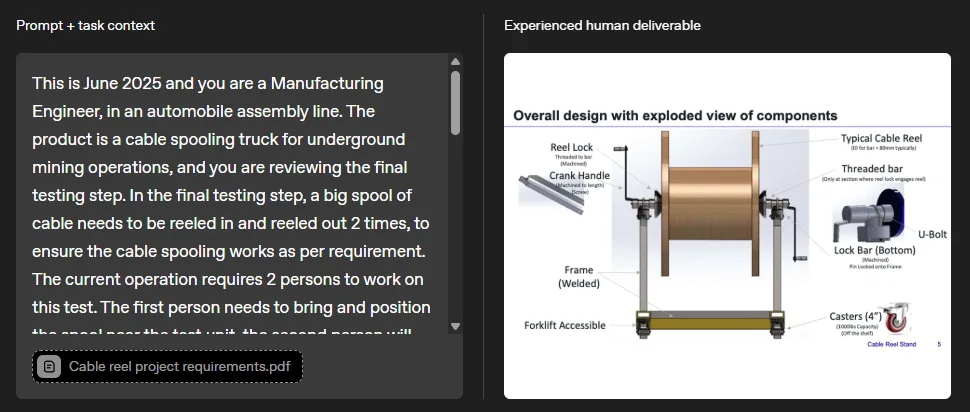 Im Gegensatz zu klassischen KI-Benchmarks bestehen GDPval-Aufgaben nicht nur aus Text-Prompts, sondern beinhalten zusätzliche Materialien und komplexe Ergebnisformate. Ein Beispiel: Ein Maschinenbauingenieur soll einen Prüfstand für ein Kabelspulsystem entwerfen, inklusive 3D-Modell und PowerPoint-Präsentation, alles auf Basis technischer Spezifikationen.