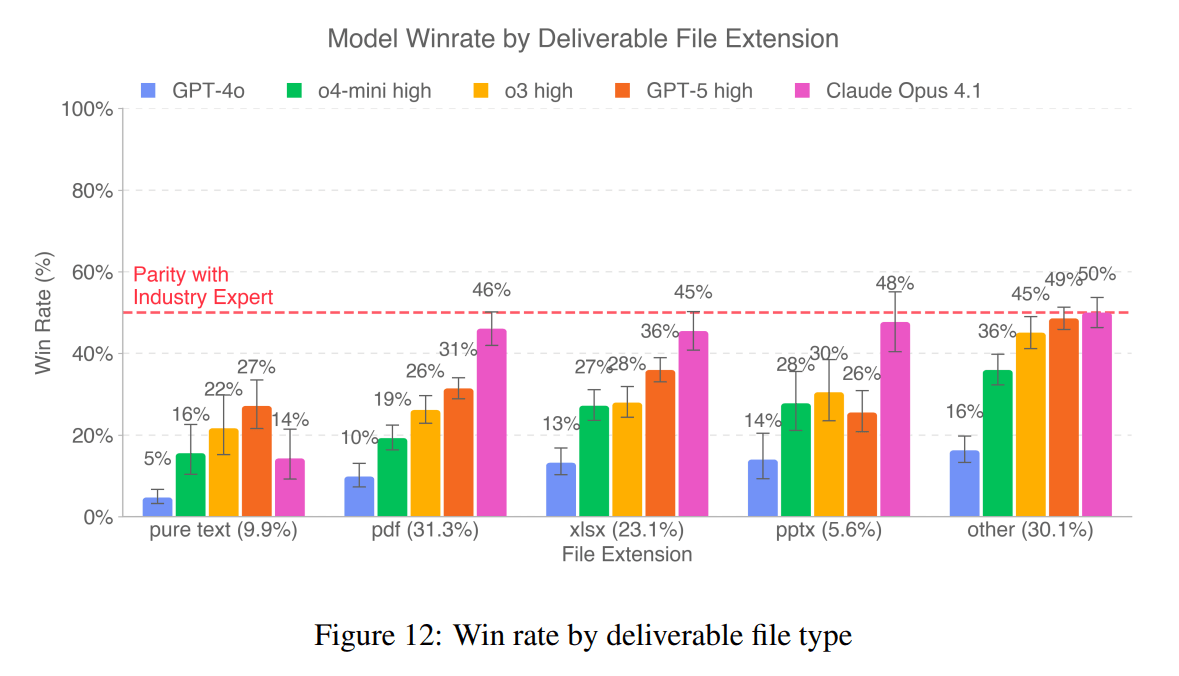 Bemerkenswert ist zudem, dass die Formate PDF, Excel und „other“ zusammen über 80 Prozent aller Deliverables ausmachen. Das erklärt, warum Modelle wie Claude Opus 4.1 insgesamt auf relativ hohe Win-Raten kommen, obwohl sie bei reinen Textaufgaben weiterhin deutlich hinter menschlichen Expertinnen und Experten liegen.