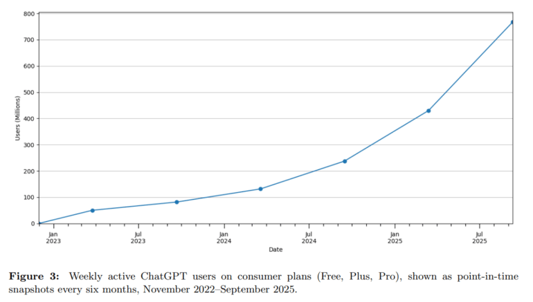 OpenAI misst bei ChatGPT-Consumer-Plänen (Free, Plus, Pro) ein starkes Wachstum über alle Kohorten hinweg. Laut dem OpenAI-Paper nutzten Ende Juli 2025 mehr als 700 Millionen Menschen wöchentlich ChatGPT – rund zehn Prozent der erwachsenen Weltbevölkerung – und verschickten etwa 18 Milliarden Nachrichten pro Woche (rund 2,5 Milliarden pro Tag, circa 29.000 pro Sekunde).